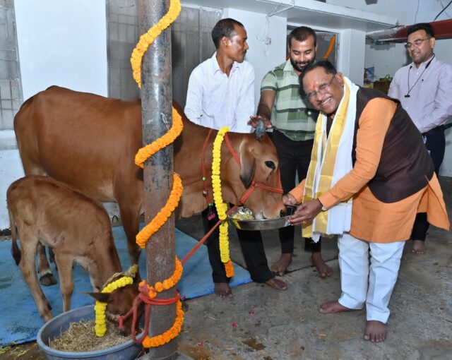 रायपुर, 22 अक्टूबर 2025/ मुख्यमंत्री श्री विष्णु देव साय ने आज मुख्यमंत्री निवास रायपुर में स्थित गौशाला में गोवर्धन पूजा के अवसर पर गौमाता की पूजा-अर्चना की और गौ माता को खिचड़ी खिलाकर गोसेवा की परंपरा निभाई। उन्होंने इस अवसर पर प्रदेशवासियों की सुख-समृद्धि, शांति और खुशहाली की मंगलकामना की।