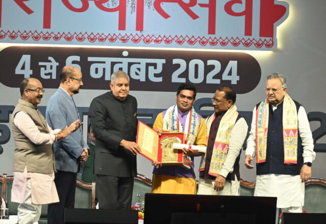 रायपुर : उप राष्ट्रपति जगदीप धनखड ने आज छत्तीसगढ़ राज्योत्सव के राज्य अलंकरण समारोह में छत्तीसगढ़ के 36 अलंकरण से विभिन्न क्षेत्रों से उत्कृष्ट योगदान देने वाले 37 विभूतियों एवं 4 संस्थाओं को सम्मानित किया। राज्यपाल श्री रमेन डेका ने समारोह की अध्यक्षता की। अति विशिष्ट अतिथि के रूप में मुख्यमंत्री श्री विष्णु देव साय और विधानसभा अध्यक्ष डॉ. रमन सिंह उपस्थित रहे।