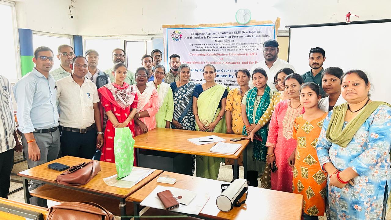 राजनांदगांव :  एनआईईपीआईडी सिकंदराबाद के प्रशासनिक नियंत्रण एवं भारतीय पुनर्वास परिषद् के तहत सीआरसी राजनांदगांव द्वारा सीआरसी एकेडेमिक बिल्डिंग बसंतपुर में दिव्यांगजन के लिए व्यापक व्यावसायिक मूल्यांकन उपकरण विषय पर दो दिवसीय सीआरई कार्यक्रम का आयोजन किया गया। कार्यक्रम में सीआरई कार्यक्रम में विभिन्न जिलों से पहुंचे आरसीआई पंजीकृत 20 प्रतिभागियों ने भाग लिया। सीआरई कार्यक्रम के सदस्य श्री गजेन्द्र कुमार साहू द्वारा सभी प्रतिभागियों को प्रमाण पत्र प्रदान कर सम्मानित किया गया। इस दौरान निदेशक सीआरसी राजनांदगांव एवं सीआरसी राजनांदगांव के पुनर्वास प्रोफेशनल श्रीमती सिमता महोबिया तथा व्यावसायिक पुनर्वास में सहायक प्रोफेसर श्री श्रीनिवासुला, विशेष शिक्षक सुश्री निधि राजन, विशेष शिक्षक श्रीमती स्नेहा शर्मा, विशेष शिक्षक श्री पुनित साहू, सहायक श्रीमती पूनम नैदानिक, व्यावसायिक चिकित्सक श्रीमती श्वेता श्रोती द्वारा सीआरई विषय एवं समय सारिणी अनुसार अपने-अपने क्षेत्र की जानकारी दी। सीआरई कार्यक्रम का समन्वयन व्यावसायिक प्रशिक्षक श्रीमती स्नेहा शर्मा द्वारा किया गया। कार्यक्रम को आरसीआई के पूर्ण मार्गदर्शन के साथ सीआरई कार्यक्रम को आरसीआई मानदंडों के साथ सफलतापूर्वक पूरा किया गया।