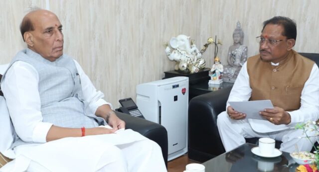 छत्तीसगढ़ के मुख्यमंत्री श्री विष्णुदेव साय ने आज नई दिल्ली में केंद्रीय रक्षा मंत्री श्री राजनाथ सिंह से उनके निवास पर सौजन्य मुलाक़ात की। बैठक में बिलासपुर एयरपोर्ट के विस्तार, रक्षा क्षेत्र के विकास, पूरे प्रदेश में सेना भर्ती रैलियों के आयोजन एवं नौसैनिक पोतों के नामकरण जैसे कई महत्वपूर्ण विषयों पर सार्थक चर्चा हुई। इस अवसर पर केंद्रीय आवासन एवं शहरी कार्य राज्यमंत्री श्री तोखन साहू और मुख्यमंत्री के प्रमुख सचिव श्री सुबोध कुमार सिंह भी उपस्थित थे।