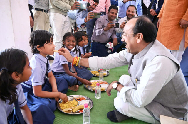 रायपुर : उप मुख्यमंत्री श्री अरुण साव तथा स्वास्थ्य मंत्री एवं गौरेला-पेंड्रा-मरवाही जिले के प्रभारी मंत्री श्री श्याम बिहारी जायसवाल आज पेंड्रा में स्कूली बच्चों के न्योता भोज में शामिल हुए। उन्होंने बड़े स्नेह से बच्चों को भोजन परोसा और उनके साथ जमीन पर बैठकर खाना खाया। प्रधानमंत्री पोषण शक्ति योजना के तहत स्वामी आत्मानंद उत्कृष्ट अंग्रेजी माध्यम विद्यालय पेण्ड्रा में गौरेला-पेंड्रा-मरवाही जिला प्रशासन द्वारा आयोजित न्योता भोज में उप मुख्यमंत्री श्री अरुण साव, स्वास्थ्य मंत्री श्री श्याम बिहारी जायसवाल, विधायक श्री धरमलाल कौशिक, श्री प्रणव कुमार मरपच्ची और श्री किरण सिंह देव ने बच्चों को खीर, पूड़ी, पुलाव, पापड़, सलाद, चटनी और केला परोसा। उन्होने नन्हें बच्चों को अपने हाथों से खाना खिलाया और उनके साथ लाइन में बैठकर भोजन किया। उप मुख्यमंत्री, स्वास्थ्य मंत्री और विधायकों के साथ जनप्रतिनिधियों ने बच्चों के साथ पौष्टिक और स्वादिष्ट न्योता भोज किया।