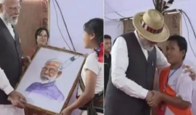 इन पीड़ितों में वह लोग शामिल थे जो हिंसा के चलते अपने घर खो चुके है और ग्राउंड में बने राहत शिविरों में रह रहे है। इस दौरान पीएम के साथ राज्यपाल अजय कुमार भल्ला भी मौजूद रहे। उन्होंने शिविरों में रह रहे बुजुर्गों और बच्चों से मुलाकात की। छोटे बच्चों ने इस दौरान पीएम का अभिवादन किया और उन्हें एक गुलदस्ता और एक पेंटिंग भी उपहार में दी। इस मुलाकात के दौरान पीएम को एक बच्चे से मिली टोपी पहने हुए देखा गया, जिस पर पक्षी के पंख लगे हुए थे।