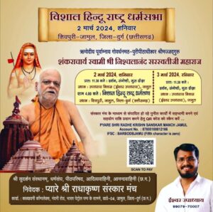 शाम 4:00 बजे विशाल हिंदू राष्ट्र सभा स्थान शिवपुरी जामुल जिला दुर्ग छत्तीसगढ़ 3 मार्च 2024सुबह 11:30 बजे दर्शन ,संगोष्ठी, गुरु दीक्षा, धर्म- राष्ट्र-अध्यात्म से संबंधित शंका समाधान प्रसादी वितरण स्थान- उपाध्याय निवास (ईश्वर उपाध्याय) जामुल।