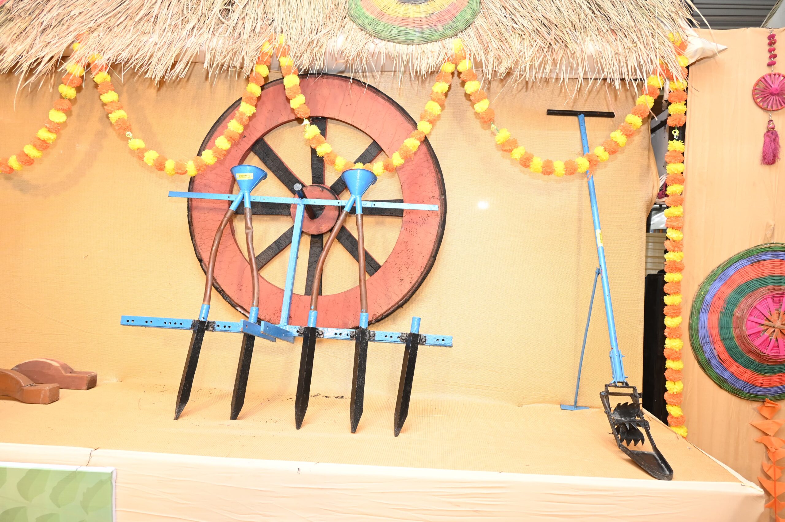 सबसे बाईं ओर दो गोलनुमा लकड़ी की संरचनाएँ रखी गई थीं, जिन्हें ‘काठा’ कहा जाता है। पुराने समय में जब गाँवों में धान तौलने के लिए काँटा-बाँट प्रचलन में नहीं था, तब काठा से ही धान मापा जाता था। सामान्यतः एक काठा में लगभग चार किलो धान आता है। काठा से ही धान नाप कर मजदूरी के रूप में भुगतान किया जाता था।