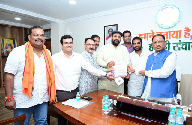 रायपुर :मुख्यमंत्री श्री विष्णु देव साय से आज यहाँ उनके निवास कार्यालय में सार्वजनिक दही हांडी उत्सव समिति गुढियारी, रायपुर के पदाधिकारियों एवं सदस्यों ने सौजन्य मुलाकात की। उन्होंने मुख्यमंत्री को भगवान श्री कृष्ण जन्मोत्सव के अवसर पर 27 अगस्त को आयोजित दही हांडी उत्सव प्रतियोगिता में शामिल होने के लिए आमंत्रित किया। मुख्यमंत्री श्री साय ने आमंत्रण के लिए समिति के सदस्यों को धन्यवाद दिया। इस अवसर पर श्री प्रबल प्रताप सिंह जूदेव, संयोजक श्री बसंत अग्रवाल, सह-संयोजक श्री हेमेंद्र साहू एवं पदाधिकारीगण उपस्थित थे।