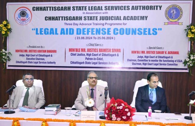 प्रशिक्षण कार्यक्रम में छत्तीसगढ़ उच्च न्यायालय के न्यायाधीश एवं छत्तीसगढ़ राज्य विधिक सेवा प्राधिकरण के कार्यपालक अध्यक्ष न्यायमूर्ति श्री गौतम भादुड़ी ने कौंसिलों से कहा कि नालसा एवं सालसा का मुख्य उद्देश्य निर्दाेष एवं जरूरतमंदों की सुरक्षा सुनिश्चित करना है। इस हेतु डिफेंस कौंसिल सिस्टम में नियुक्त सभी कौंसिल अपने कार्य को नियोजन न मानकर सेवा कार्य के रूप में जिम्मेदारी से निर्वहन करें।