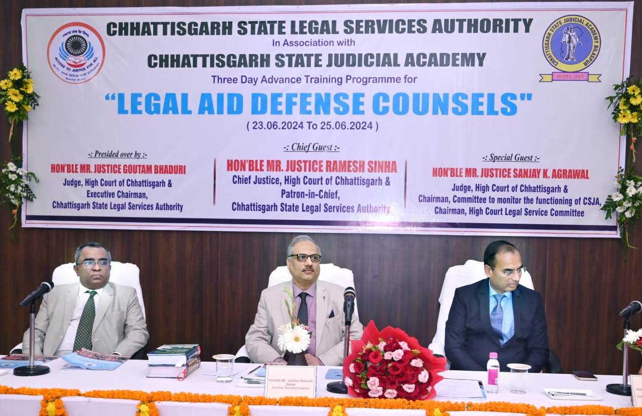 रायपुर : छत्तीसगढ़ राज्य विधिक सेवा प्राधिकरण, बिलासपुर के द्वारा राज्य न्यायिक एकेडमी के सहयोग से छत्तीसगढ़ राज्य के 23 जिलों में स्थापित लीगल एड डिफेंस कौंसिल सिस्टम में नियुक्त चीफ, डिप्टी एवं असिस्टेंट लीगल एड डिफेस कौंसिलों हेतु तीन दिवसीय एडवांस ट्रेनिंग प्रोग्राम का आयोजन राज्य न्यायिक एकेडमी, बिलासपुर में किया गया।