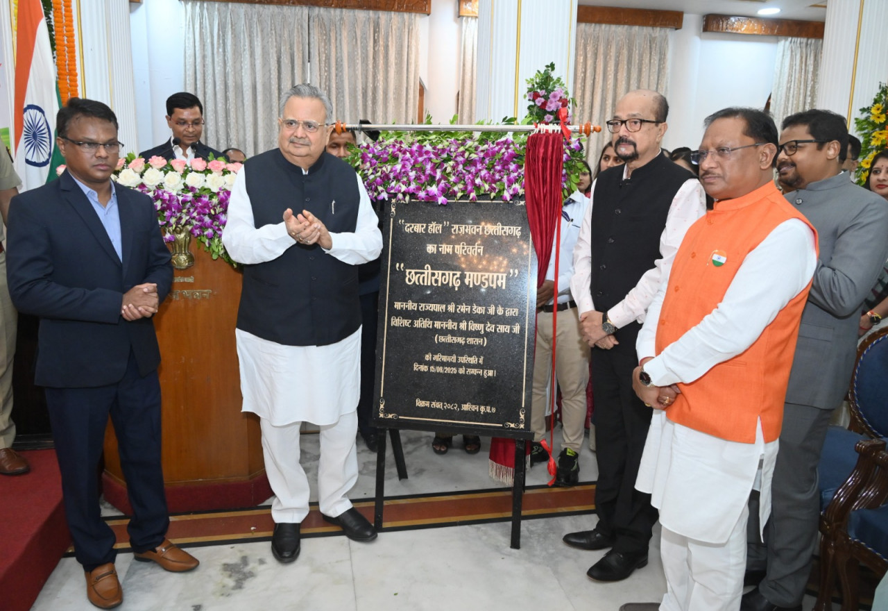 राजभवन के दरबार हॉल का नाम परिवर्तन कर ‘छत्तीसगढ़ मण्डपम‘ किया गया है। राज्यपाल श्री रमेन डेका ने आज स्वतंत्रता दिवस के अवसर पर दरबार हॉल का नाम परिवर्तन कर छत्तीसगढ़ मण्डपम करने की घोषणा की एवं इसका विधिवत अनावरण किया। इस अवसर पर विशिष्ट अतिथि मुख्यमंत्री श्री विष्णुदेव साय, विधानसभा अध्यक्ष डॉ. रमन सिंह, उप मुख्यमंत्री श्री विजय शर्मा, खेलकूद एवं युवक कल्याण मंत्री श्री टंकराम वर्मा सांसद श्री बृजमोहन अग्रवाल एवं अन्य जनप्रतिनिधि मुख्य सचिव श्री अमिताभ जैन, डीजीपी श्री अरूण देव गौतम तथा अन्य वरिष्ठ अधिकारीगण एवं गणमान्य नागरिक उपस्थित थे।