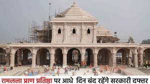 रायपुर : अयोध्या में रामलला की प्राण प्रतिष्ठा के अवसर पर छत्तीसगढ़ में 22 जनवरी को आधे दिन का शासकीय अवकाश घोषित किया गया है। मुख्यमंत्री श्री विष्णु देव साय ने आज पत्रकारों से चर्चा के दौरान इस बात की जानकारी दी।