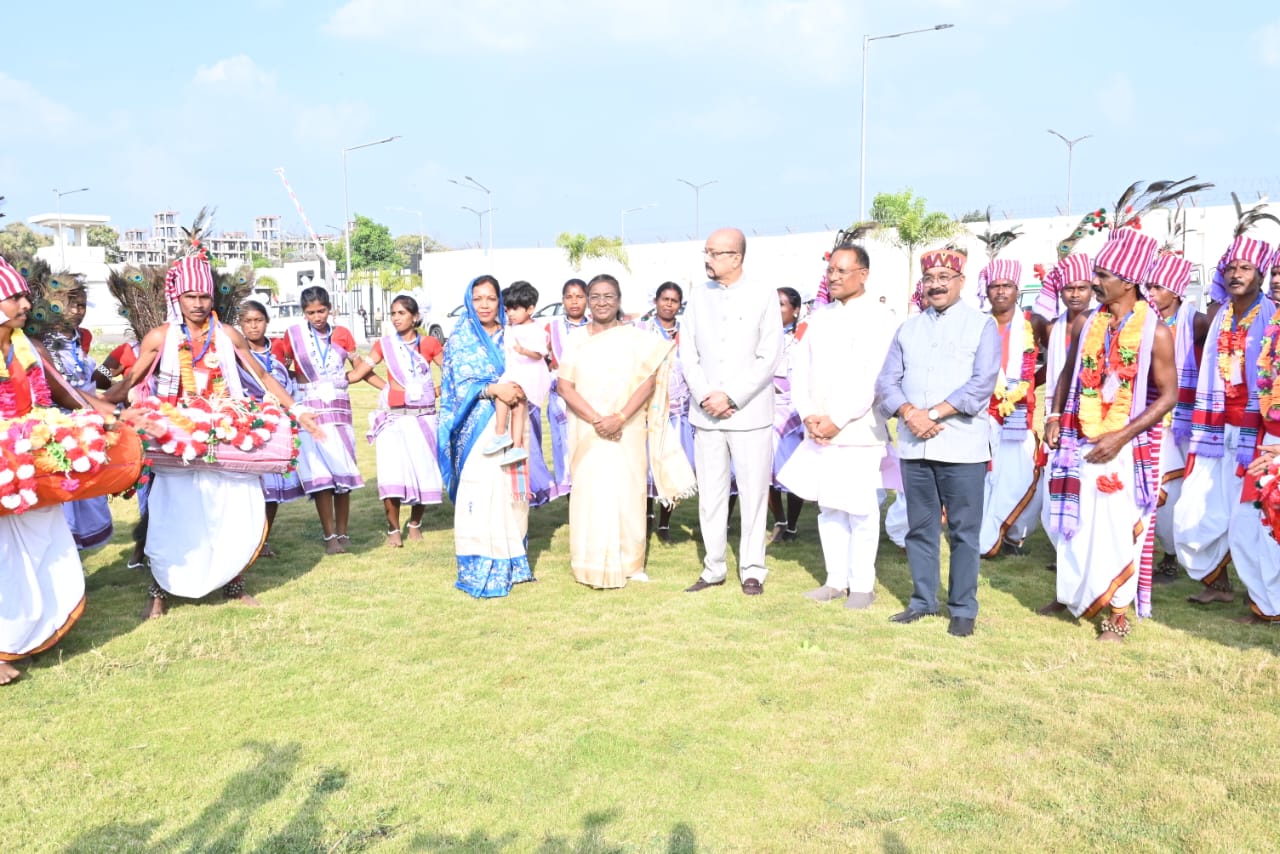 इस अवसर पर राष्ट्रपति श्रीमती मुर्मु के स्वागत में जशपुर जिले से आए करमा नर्तक दल ने मनमोहक शैली में नृत्य प्रस्तुत किया। इन मंजे हुए कलाकारों की मांदर की थाप पर लयबद्ध प्रस्तुति देखकर राष्ट्रपति श्रीमती द्रौपदी मुर्मु ने करमा नर्तक दलों के बीच पहुंचकर उनका उत्साहवर्धन किया और उनके साथ फोटो खिंचवाई।