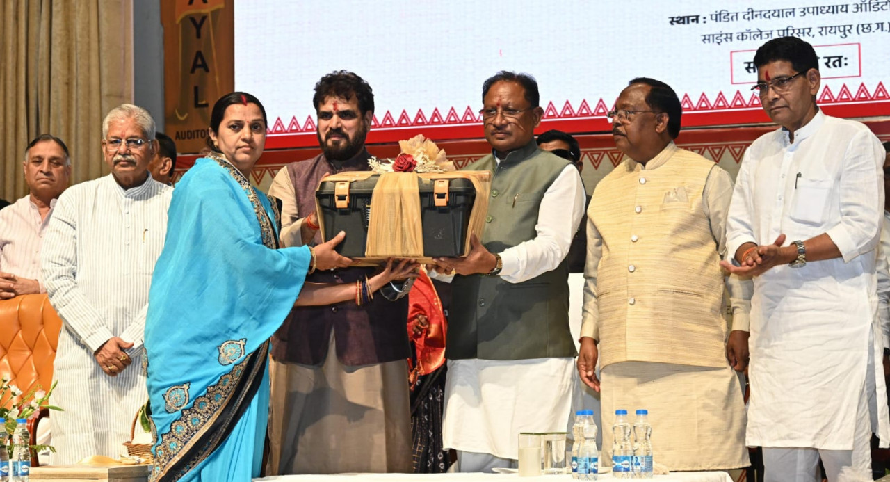 मुख्यमंत्री श्री विष्णुदेव साय आज राजधानी स्थित पंडित दीनदयाल उपाध्याय ऑडिटोरियम में छत्तीसगढ़ खादी तथा ग्रामोद्योग बोर्ड के नवनियुक्त अध्यक्ष श्री राकेश पांडेय के पदभार ग्रहण कार्यक्रम में शामिल हुए। उन्होंने श्री पांडेय को नए दायित्व के लिए बहुत-बहुत बधाई और शुभकामनाएं दीं। इस अवसर पर राष्ट्रीय बांस मिशन अंतर्गत 10 महिला हितग्राहियों को बांस टूल किट प्रदान की गई।