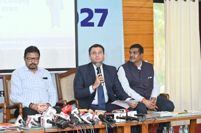 अपर मुख्य सचिव एवं जनगणना , छत्तीसगढ के नोडल अधिकारी श्री मनोज पिंगवा और जनगणना निदेशालय छत्तीसगढ के निदेशक श्री कार्तिकेय गोयल पत्रकारों से चर्चा करते हुए